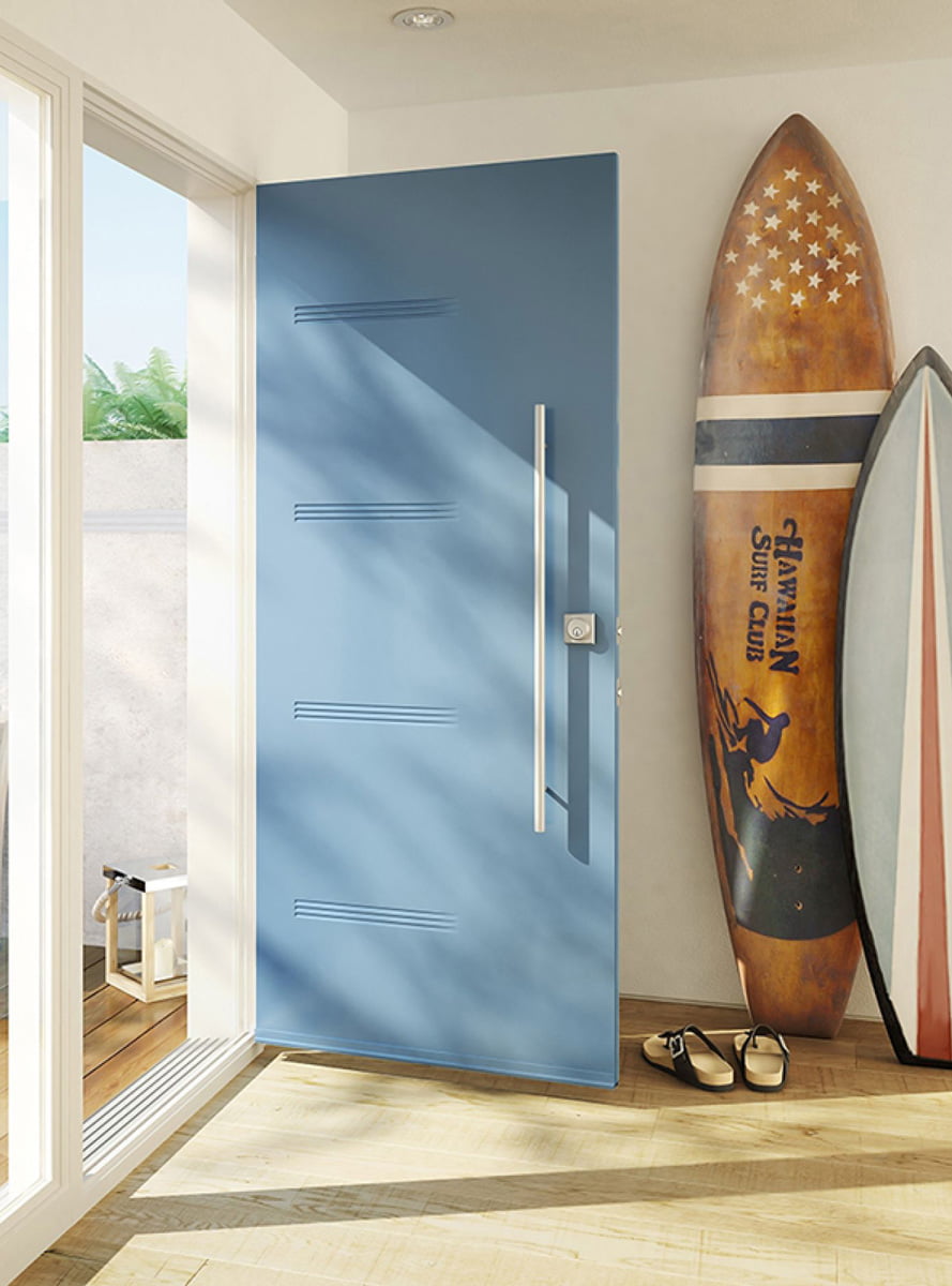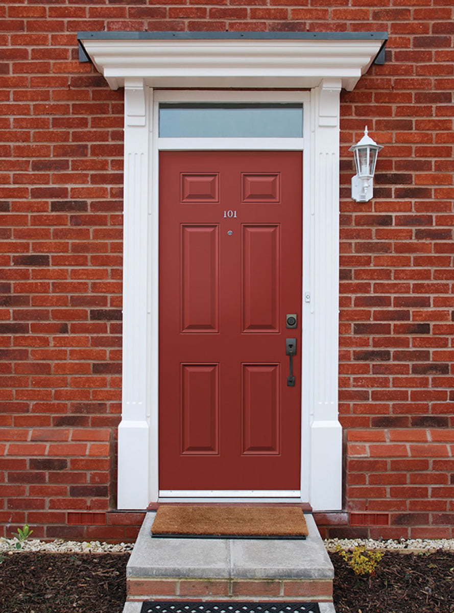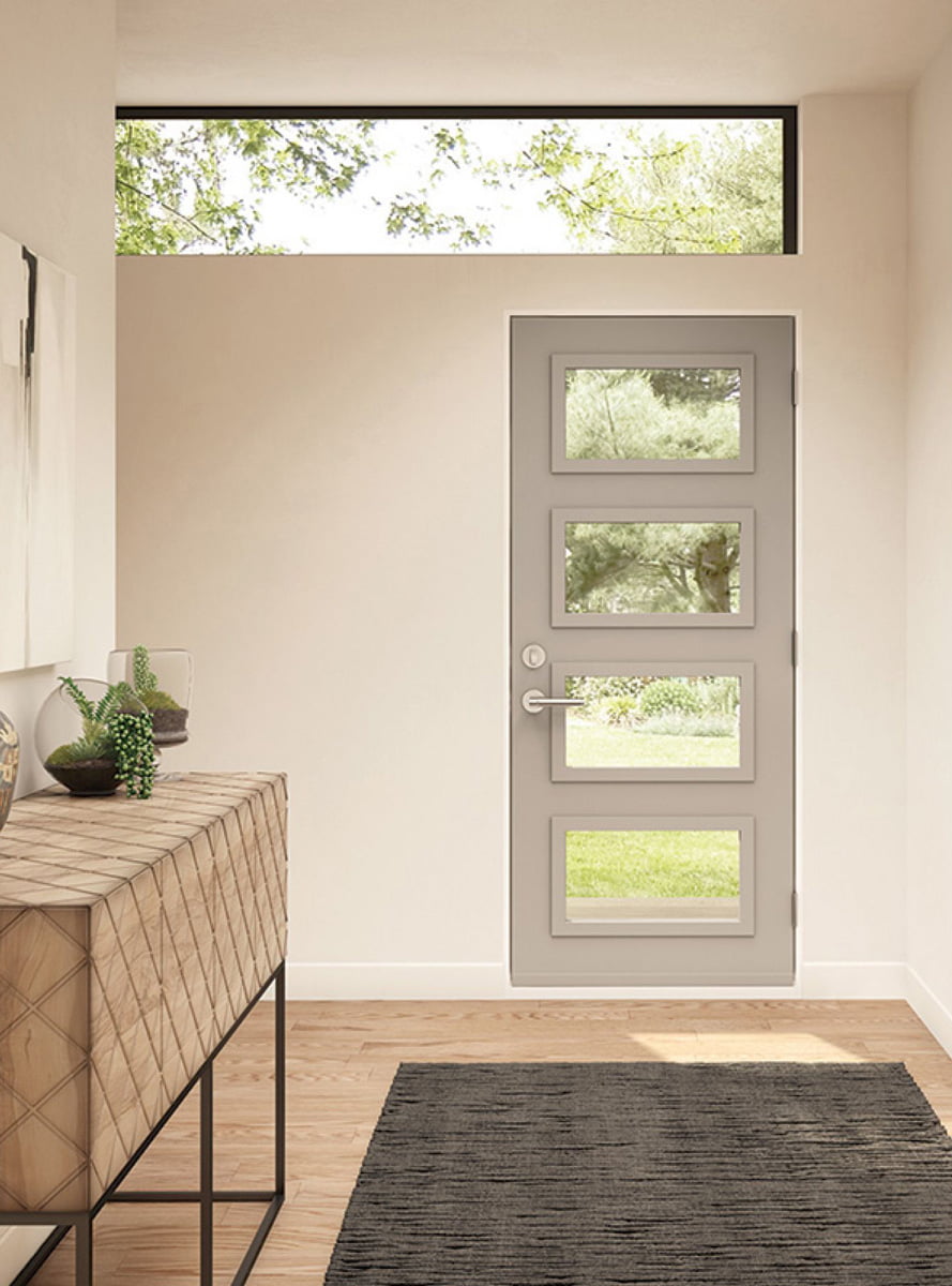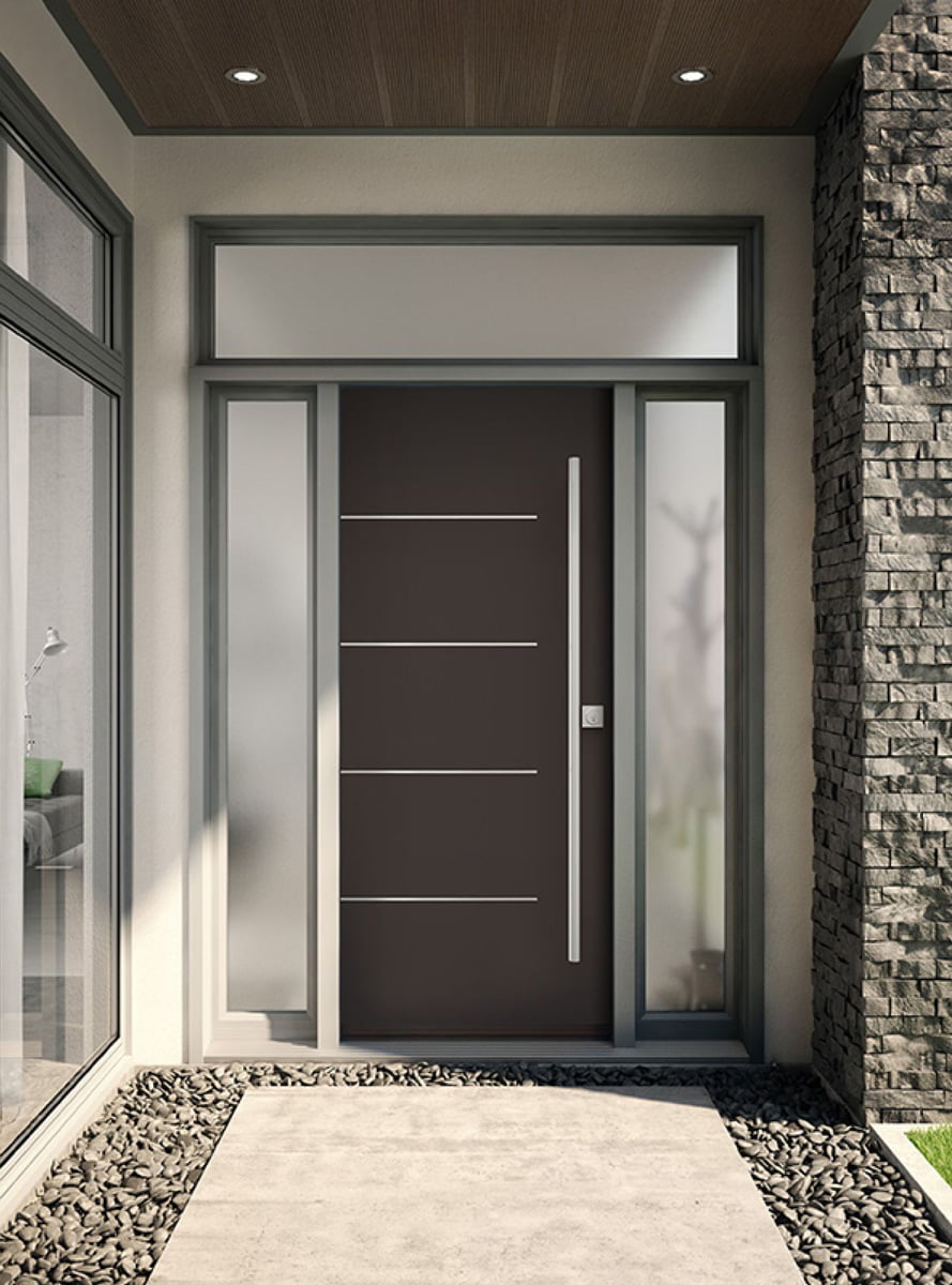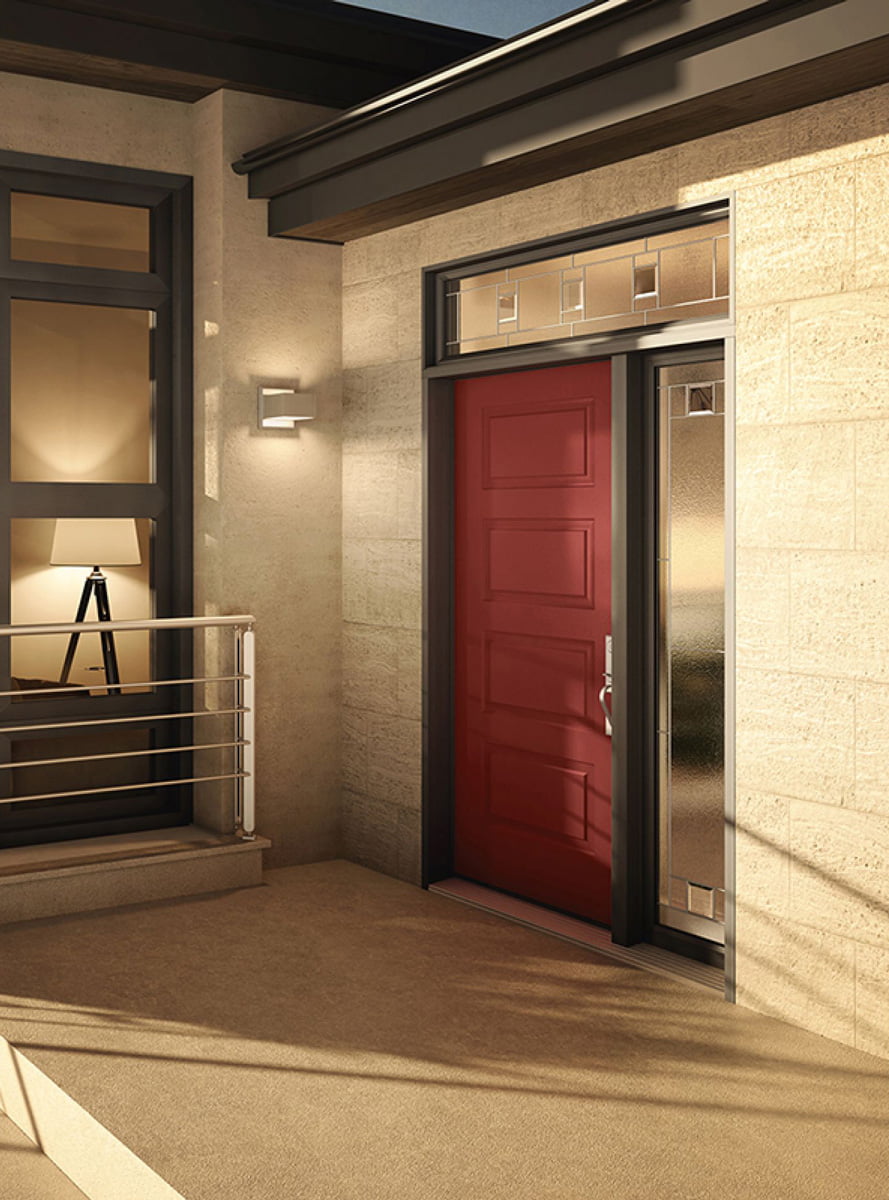 Our entry doors are made from steel. Our steel entry doors are known for their strength, security, and durability. They are resistant to the harsh Canadian weather, cracking, and warping. Our steels doors come in a variety of colours and styles, and have an insulated core for energy efficiency.